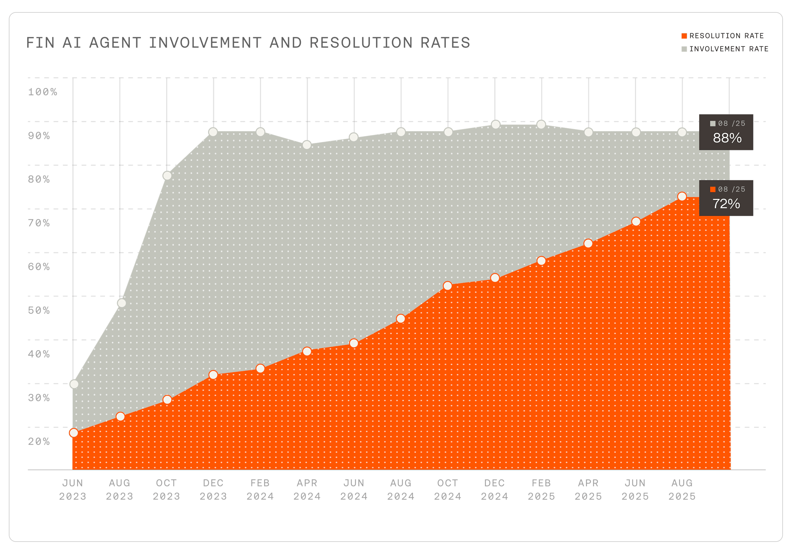 - 88% of all support conversations now involve Fin, with 100% of chat conversations starting with the AI Agent.