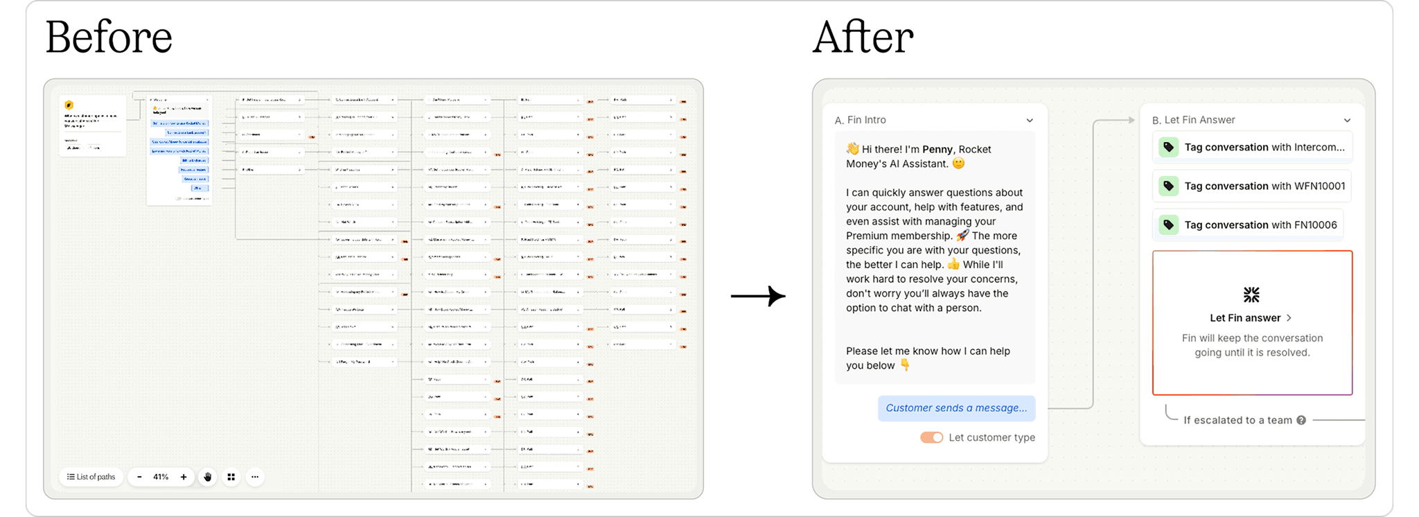“Every step of the rollout was deliberate. We tested, we measured, and we made sure the experience was up to our standard before we expanded.”Some of Rocket Money’s most common support needs are also the most sensitive, so every workflow was tested and monitored closely. Routing rules and logic paths were built to ensure Fin only handled queries it was equipped to resolve, and that high-risk or sensitive issues were escalated immediately.