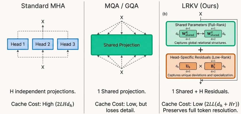 The key idea is that attention heads are not independent. There’s structured redundancy across heads – yet fully sharing keys/values (like in MQA/GQA) can constrain expressivity. LRKV instead exploits redundancy using a shared full-rank KV basis plus head-specific low-rank residuals, yielding a continuous knob between complete sharing and full per-head independence