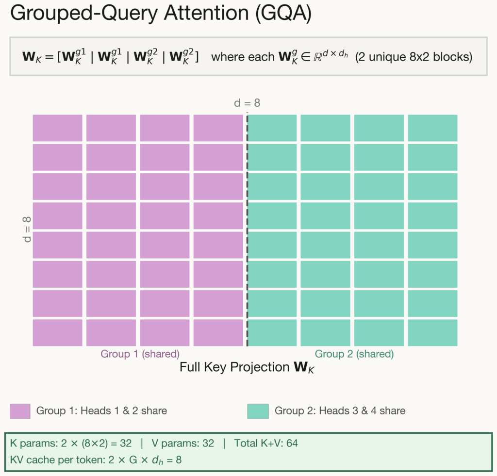 Grouped-Query Attention offers a middle ground between MHA and MQA. Attention heads are divided into G groups, and all heads within the same group share a single key and value projection. In the example above, \(G= 2\): heads 1 & 2 share one projection while heads 3 & 4 share another. This allows groups to specialize in different roles. For instance, one group might focus on local syntax while another captures long-range dependencies. The KV cache reduces from \(2Hd_h\) to \(2Gd_h\) per token. In practice, G is typically set to H/4 or H/8, yielding a 4-8× cache reduction.