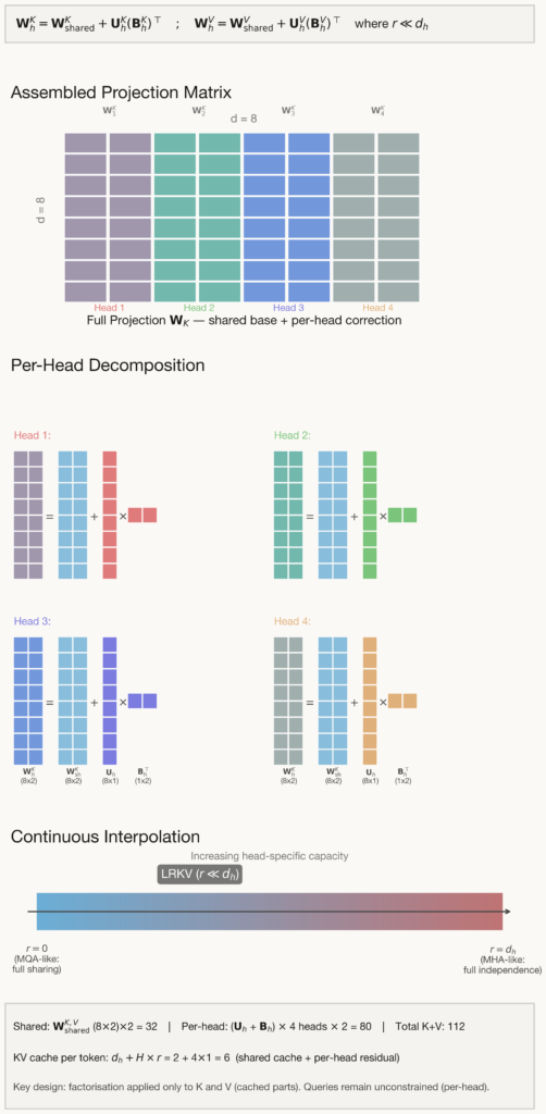 There’s a fundamental trade-off here: heads can specialise (unlike MQA/GQA) – but they must reconstruct their keys and values from a shared compressed representation. Any per-head information that does not survive this bottleneck is permanently lost at inference time. We can compare this with LRKV, where each head’s low-rank correction is baked directly into the weight matrix – getting around the information bottleneck during inference.