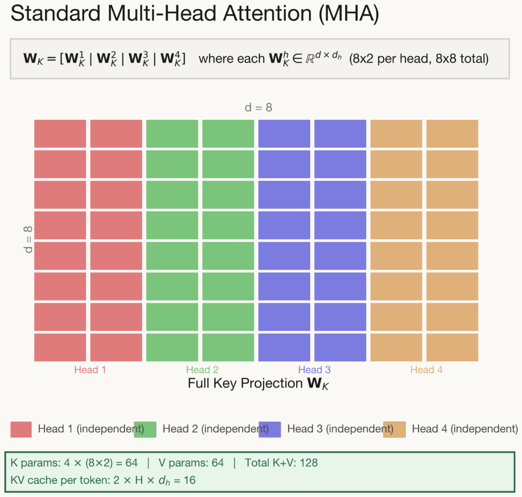 The full projection matrix is formed by concatenating H independent weight blocks side by side, i.e. there is no parameter sharing whatsoever between heads. This gives each head complete freedom to learn specialised key/value representations, making MHA the most expressive configuration available. However, this expressiveness comes at a steep cost: the KV cache scales linearly with the number of heads (\(2Hd_h\) values stored per token), making it the most memory-intensive option during long-context inference.