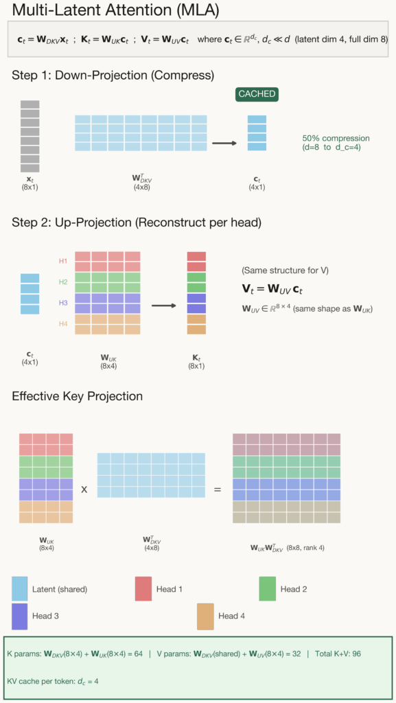 This architecture works in two stages. First, a down-projection compresses each token into a latent of dimension \(d_c\) (much smaller than \(d\)). Second, separate up-projections reconstruct per-head keys and values from this shared latent. The effective key projection is an 8×8 matrix but has rank at most d_c. This resembles MHA’s full projection but lives in a lower-dimensional subspace.