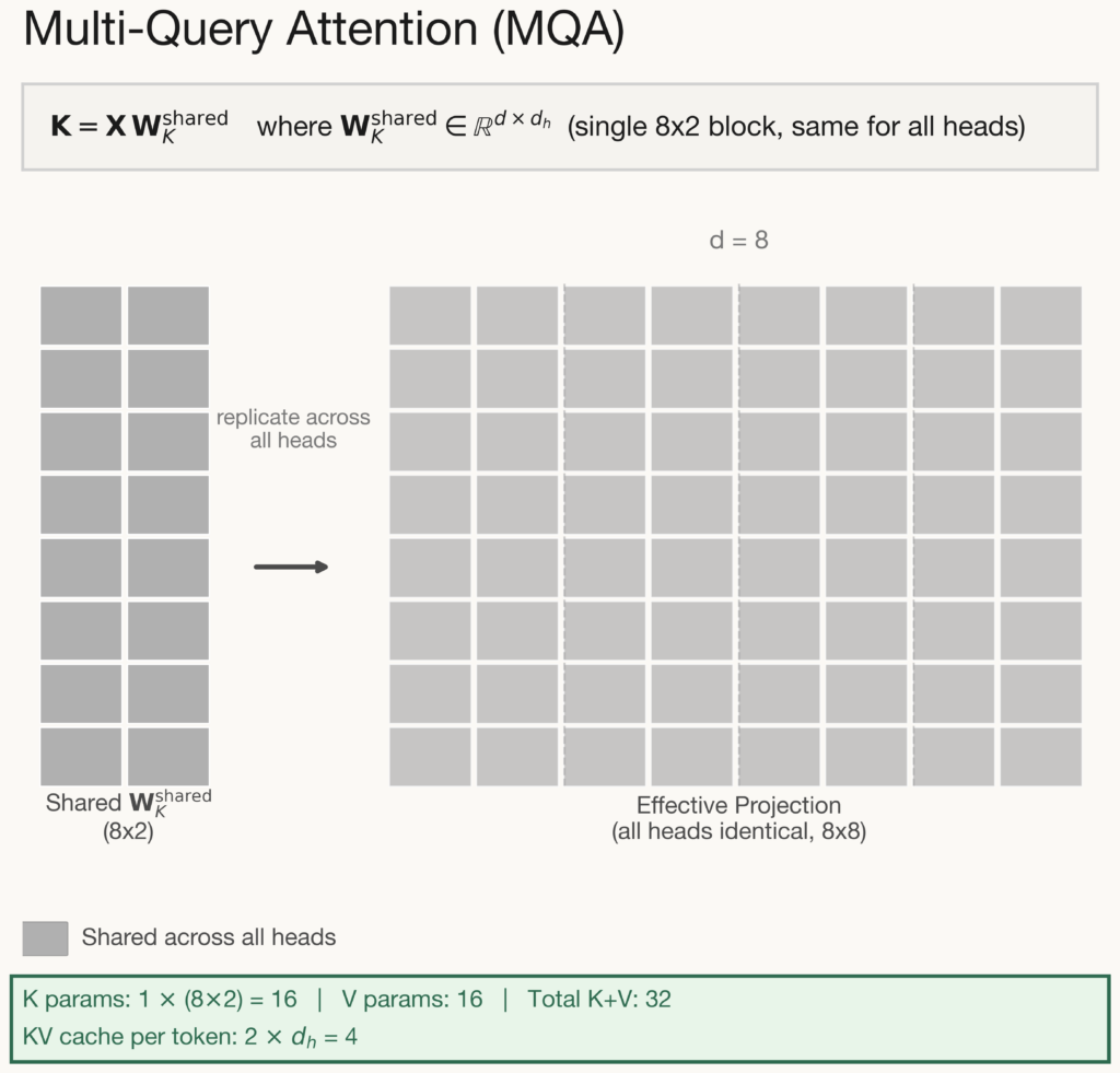 Multi-Query Attention takes the most aggressive approach to KV cache reduction: all heads share a single key and value projection. Each head still computes its own query, preserving some capacity for diverse attention patterns. However, every head attends over the exact same keys and values. The KV cache shrinks from \(2Hd_h\) to just \(2d_h\) per token – a 75% parameter reduction that is transformative for long-context inference where cache memory is the primary bottleneck.