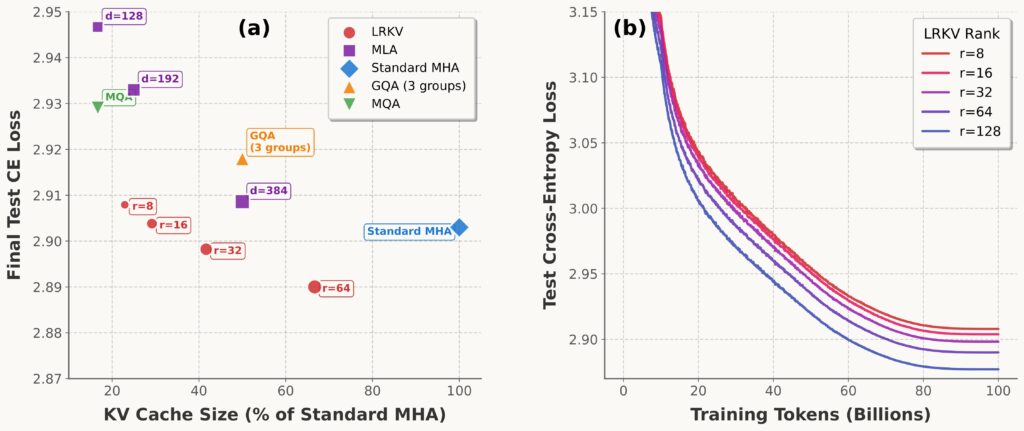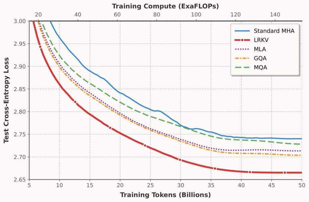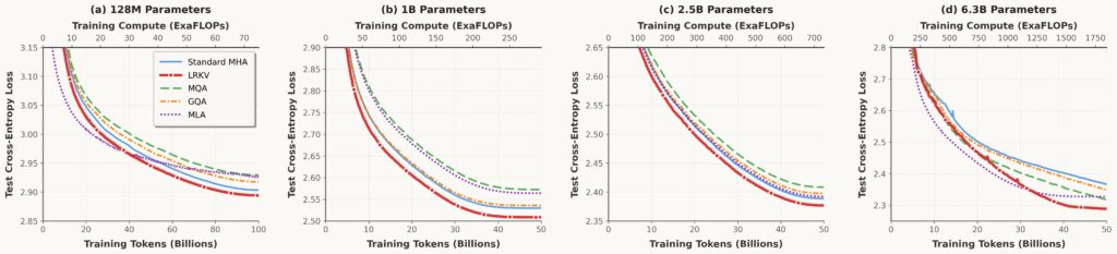 - Across 128M → 6.3B, LRKV reaches lower test loss than MHA, MQA/GQA, and MLA, while using 45–53% of MHA KV cache.