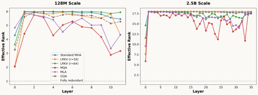 We see LRKV exhibits very similar patterns to Standard MHA with sufficient rank of r=64 and achieves 98.3% effective rank at 2.5B scale versus 98.9% for Standard MHA. In contrast, MQA achieves only 86.2% and GQA 95.4%.
