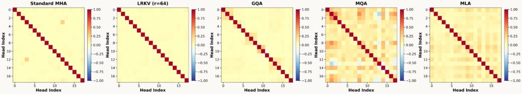 The distinction between uncentered and PCA-based effective rank reveals LRKV’s factorization structure. Uncentered analysis measures total variance including the shared mean direction, the global structure captured by Wshared. PCA-based analysis centers the Gram matrix, isolating variance around this mean and measuring true head independence. The modest 4.8% gap indicates LRKV achieves diversity primarily through genuine per-head specialization rather than merely perturbing a dominant shared structure. For comparison, MQA shows dramatic improvement from uncentered (86.2%) to centered (91.0%), a compensation effect where forced KV sharing creates a strong mean direction, but heads recover diversity by aggressively diversifying query projections around this baseline.