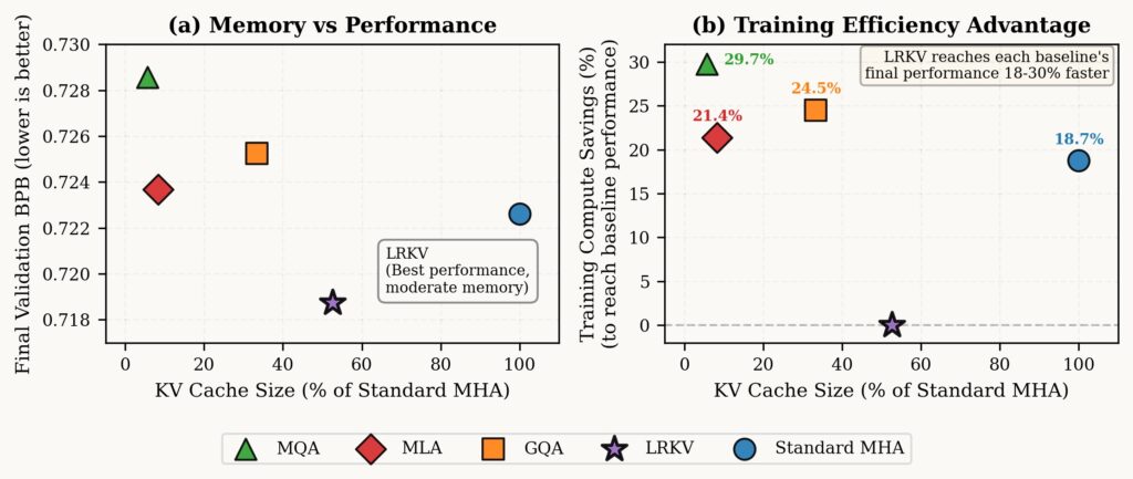 Our results are very encouraging: LRKV reaches each baseline’s final validation performance 18-30% faster, averaging 23.6% training compute savings across all baselines while achieving better final performance. Critically, this reveals an asymmetric advantage: LRKV reaches any baseline’s performance target early in training, but no baseline reaches LRKV’s final performance (0.719 BPB) even after the full token budget.